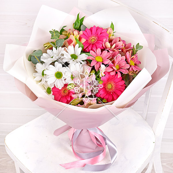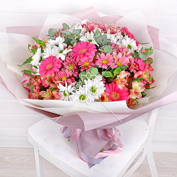 Розовые герберы, кустовые хризантемы белого и розового цветов, нежная альстромерия розового оттенка и зелень эвкалипта в единой композиции смотрятся свежо, мило и гармонично! Нежные лепестки очаровывают и привлекают восхищенный взгляд.