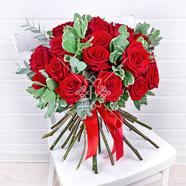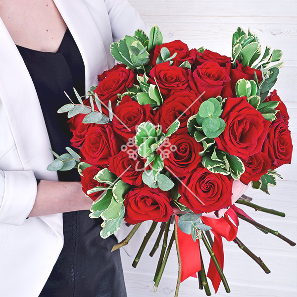Насыщенно-алая роза символизирует глубокую любовь, привязанность и страсть, а так же уважение и восхищение. В обрамлении зелени эвкалипта и питтоспорума – букет смотрится великолепно и стильно!