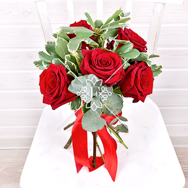 роза красная - 5 шт., зелень декоративная (эвкалипт, питтоспорум), лента.